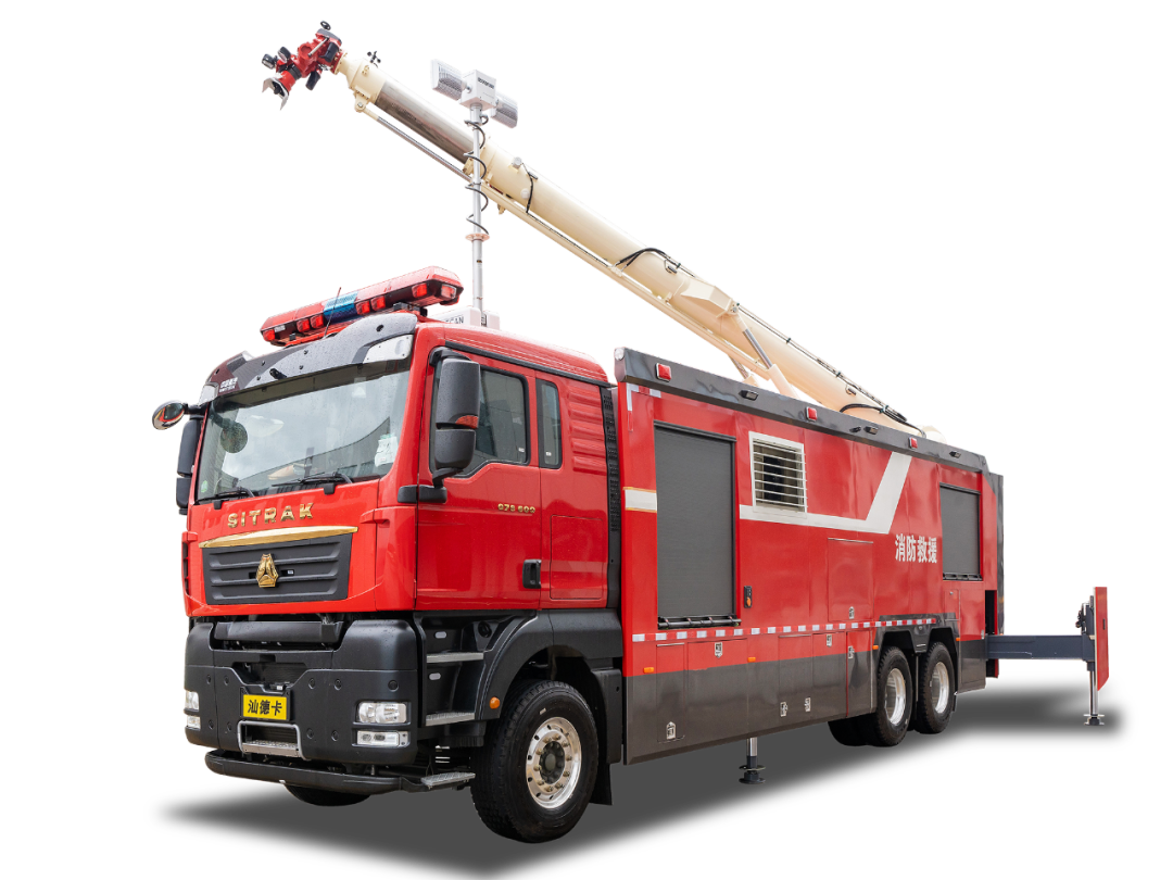 “龙吸水”举高喷射消防车,是侨龙最新研发的一款具有消防炮灭火、中继加压远程供水、辅助吊拉、夜间作业照明和器材运输功能于一体的灭火装备。
