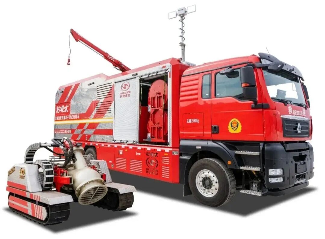 “龙吸水”大流量子母式供排水抢险车是一款集排涝、快速收放水管、辅助吊拉及器材运输于一体的应急抢险装备,流量≥4000m³/h,单泵扬程≥10m,满足应急管理部关于北斗导航定位有关要求。安装车辆数据采集终瑞,能够接入应急管理部应急装备综合信息大数据智能服务系统。